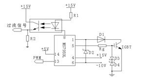 驱动电路的作用是将SG3525输出的2路PWM 脉冲进行功率放大,以驱动IGBT。M57959L是日本三菱公司为驱动IGBT而设计的厚膜集成电路,具有封闭性短路保护功能,其实质是一个隔离型放大器,采用光耦合方法实现输入与输出的电气隔离,隔离电压高达2500V;配置了短路/过载保护电路。M57959L驱动电路如图5所示。电阻Rg为IGBT栅极限流电阻,二极管D1是过载/短路检测二极管,稳压二极管D2用以补偿D1反向恢复时间(在D1反向恢复时间偏长时使用),稳压二极管D3、D4用于保护IGBT的发射结。