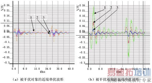 在当今高速系统的设计实现中,多层 PCB板已经被广泛地用于电路的布局布线中,采用多层PCB板的最大优点是可以在有限面积的条件下,极大地提高布线资源,设计中使用的元器件在布局时即使摆放的很密,也可以通过多层信号走线来实现互连,从而使系统的小型化成为现实。多层 PCB板一般都包括若干个信号层和若干个电源层,多个信号层和电源层的叠放顺序没有特殊规定,但通常是通过叠放顺序来构成标准的微带传输线和带状传输线。对于微带传输线和带状传输线来说,与之相邻的一般都有一个电源平面,相应信号层与电源层之间是用电介质填充的。我们知道,这个电介质层的厚度是影响传输线特性阻抗的重要因素,当它变厚时,传输线特性阻抗变大,当它变薄时,传输线特性阻抗变小。实际上,电介质层的厚度对串扰的影响也十分显著,这里对图 13中的两线系统在布线时分别采用微带传输线(第一层)和带状传输线(第三层)两种布线结构进行了仿真,这两种情况除了使用不同的布线层以外,其它条件如两线平行长度、间距、信号频率等均不变。因为二者相邻的电源平面均有地平面,我们通过改变传输线信号层与地平面层之间电介质的厚度(第一层和第二层之间电介质层的厚度,第二层和第三层之间电介质层的厚度)来观察串扰的变化。仿真结果为电介质厚度 取三个典型值 3.6mils、7.2mils、14.4mils时相应微带传输线和带状传输线上的串扰。图 19和图 20分别为微带传输线和带状传输线上相对不同电介质层厚度的串扰波形,图中标记“1”、“2”、“3”箭头所指分别为电介质层厚度取 14.4mils、7.2mils、3.6mils时相应的被干扰对象的近端串扰波形(图a)和远端串扰波形(图 b)。表 5给出了被干扰对象的远端峰值串扰。