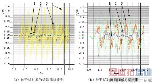 串扰是与方向有关的,其波形是电流流动方向的函数,这里我们作了两种情况的信号仿真。第一种情况是干扰源线网与被干扰对象线网的电流流向相同,第二种情况是干扰源线网与被干扰对象线网的电流流向相反(AB线网中的驱动源与负载互换位置,即位于 B点的为驱动源,而位于 A点的为负载),在这两种情况下,AB和 CD线网都加入 20MHz的信号,表 5.4给出了远端 D点的串扰峰值,串扰的波形仿真结果如图 14所示。图中,左边图(a)所示为电流流向为同向时的串扰波形,右边图(b)所示为电流流向为反向时的串扰波形,标记“1”和标记“2”箭头所指的波形分别为被干扰对象远端 D点和近端 C点的串扰信号波形。