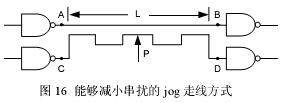 由仿真结果可见,当两线的间距拉大时(P由 5mils变为 10mils),串扰明显地减小了,而当两线的平行长度加长时(L由 1.3inches变为 2.6inches),串扰显著增大了。由此可知,串扰电压的大小与两线的间距成反比,而与两线的平行长度成正比,但却不是完全的倍数关系。在实际高速电路中进行布线时,当布线空间较小或布线密度较大时,应慎重对待信号线之间的串扰问题,因为高频信号线对与其相邻的信号线的串扰可能会导致门级的误触发,而这样的问题在电路调试的过程中是很难被轻易发现并妥善解决的。因此,在布线资源允许的条件下,应近可能地拉开线间距(差分线除外)并减小两根或多根信号线的平行长度,必要时可采用固定最大平行长度推挤的布线方式(也称 jog式走线),即对于平行长度很长的两根信号线,在布线时可以间断式地将间距拉开,这样既可以节省紧张的布线资源,又可以有效地抑制串扰,走线示意图如图 16所示。