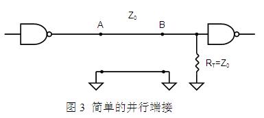这种端接方式是简单地在负载端加入一下拉到GROUND的电阻RT(RT=Z0)来实现匹配,如图3所示。采用此端接的条件是驱动端必须能够提供输出高电平时的驱动电流以保证通过端接电阻的高电平电压满足门限电压要求。在输出为高电平状态时,这种并行端接电路消耗的电流过大,对于50Ω的端接负载,维持TTL高电平消耗电流高达48mA,因此一般器件很难可靠地支持这种端接电路。