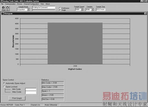 对电路的深入研究表明,时序图上看到的噪声源来自于开关电源。电路中添加了旁路电容和扼流环。电源上加了一个10mF的电容,并且在尽可能靠近有源元件的电源引脚旁放置了三个0.1mF的电容。在产生的新时序图上可以看到,产生了稳定的直流输出,图3所示的柱状图可验证这一点。数据显示,电路的这些更改消除了来自电路信号路径的噪声源。