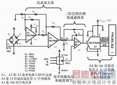 图1 SCX015压力传感器输出端的电压由仪表放大器(A1和A2)放大。在仪表放大器之后,添加了一个低通滤波器 (A3),以消除来自12位A/D转换器转换的混叠噪声。