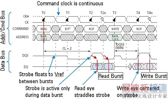 图1是DDR总线的体系结构。其中DQS是源同步时钟,在接收端使用DQS来读出相应的数据DQ,上升沿和下降沿都有效。DDR1总线,DQS是单端信号,而DDR2&3, DQS则是差分信号。DQS和DQ都是三态信号,在PCB走线上双向传输,读操作时,DQS信号的边沿在时序上与DQ的信号边沿处对齐,而写操作时,DQS信号的边沿在时序上与DQ信号的中心处对齐,参考图2,这就给测试验证带来了巨大的挑战:把“读”信号与“写”信号分开是非常困难的!