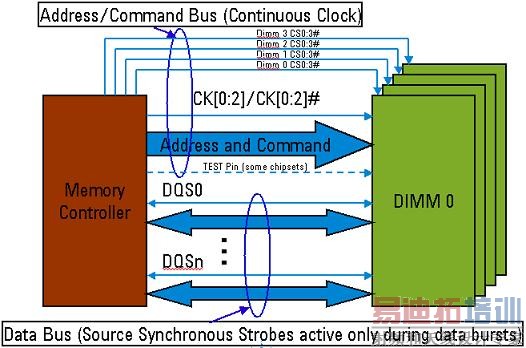 图2中,Addr/Cmd Bus意思是地址/命令总线,都是时钟的上升沿有效,其中命令由:/CS(片选),/RAS, /CAS,/WE(写使能)决定,比如:“读”命令为:LHLH,“写”命令为:LHLL等。操作命令很多,主要是NOP(空超作),Active(激活),Write,Read,Precharge (Bank关闭),Auto Refresh或Self Refresh(自动刷新或自刷新)等(细节请参考:Jedec规范JESD79)。Data Bus是数据总线,由DQS的上升沿和下降沿判断数据DQ的0与1。