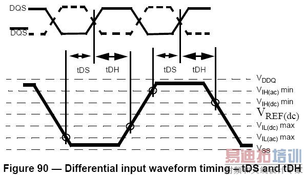 其中,VIH(ac)min是VIH(ac)规范的最小值,VIL(ac)max是VIL(ac)规范的最大值,Vref是参考电压,对DDR1来说是1.25V,DDR2来说是0.9V,DDR3来说是0.75V。