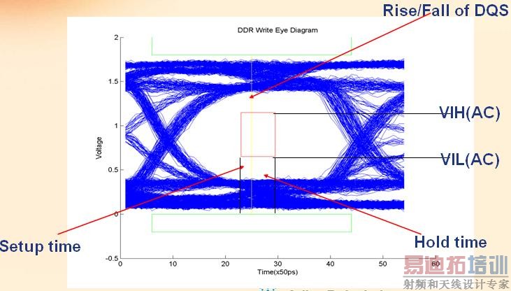 基于tDS和tDH 和VIH(ac)min和VIL(ac)max参数,我们可以得出DDR2 533“写”眼图的模板如图8示。中间的红色区域就是模板,Setup time是tDS建立时间,Hold time是tDH 保持时间,VIH(AC)是VIH(ac)min值,VIL(AC)是VIL(ac)max值。中间的黄色线是DQS的有效边沿即有效的上升沿或下降沿。