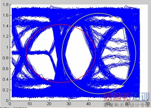 这个DDR“读”“写”眼图分析软件的算法是什么呢?其实很简单,如图6所示,如果直接用DQS触发DQ,则会形成比较乱的眼图,但是中间又包括需要的信息,如图中的红色圆圈周围的是“写”眼图信息,途中的黄色圆圈周围则是“读”眼图信息。而眼图之所以乱,是因为同时包括“三态”信号和“读”“写”信号,而“读” 和“写”信号的时序是矛盾的。使用软件进行分离的处理比较容易:首先,扔掉三态信号,保留有用信息,软件设计时,检测DQS有效边沿,离DQS有效边沿较远的信号就是三态信号,扔掉它;然后,根据建立时间和保持时间的关系把“读”信号和“写”信号分成两个数据库;最后,把“读”信号数据库按DQS有效边沿放在一起形成眼图,把“写”信号数据库按DQS有效边沿放在一起形成眼图,分别调用模板产生测试结果。