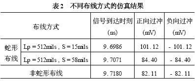 对于图5 所示的“蛇形”布线方式“, 蛇形”线的间距S ,以及耦合长度Lp ,对于信号完整性有一定的影响,这可以从表2 的仿真结果得到说明。
