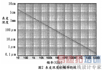 随着频率的增加一般电路板的导线表皮效应也越来越明显,MCM的导线pattern祇有数μm,因此比较不易产生表皮效应。所谓表皮效应是指随着频率的增加,电流祇会集中于导体的表面,造成电流不易在导体内流动。如图2所示例如频率为500MHz时表皮深度为3μm,1GHz时表皮深度为2μm,也就是说MCM的pattern厚度与表皮深度非常接近,然而一般电路板的pattern厚度约为40μm,即使pattern厚度等价变薄波形依旧会劣化,因此不得不采用加大pattern宽度之对策,然而加大pattern宽度却违背导线微细化的要求。