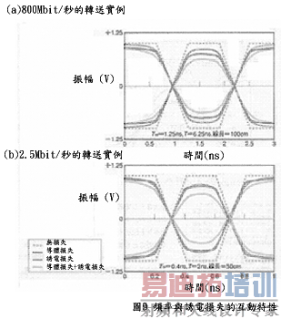 所谓诱电损失是指传送途中导体(电线)与接地线之间的电容器(capacitor)储蓄的电荷发生漏电所造成的损失。当电路板的传送速度超过2.5Gbit/sec时,诱电损失与导体损失所产生的影响几乎相同,因此必需藉由基板材质的诱电正接(tanδ)或是导线图案(pattern)的尺寸以及其它条件的改变,以模拟分析的方式调查诱电损失与导体损失对传送波形的影响,再根具上述结果实施对策,使超过GHz的信号可作高速传送。