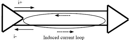 图3:即使差分信号严格大小相等且极性相反,因而没有流经电源系统的返回电流,仍然在走线下方的平面中存在在一个环路中流动的感应电流。
