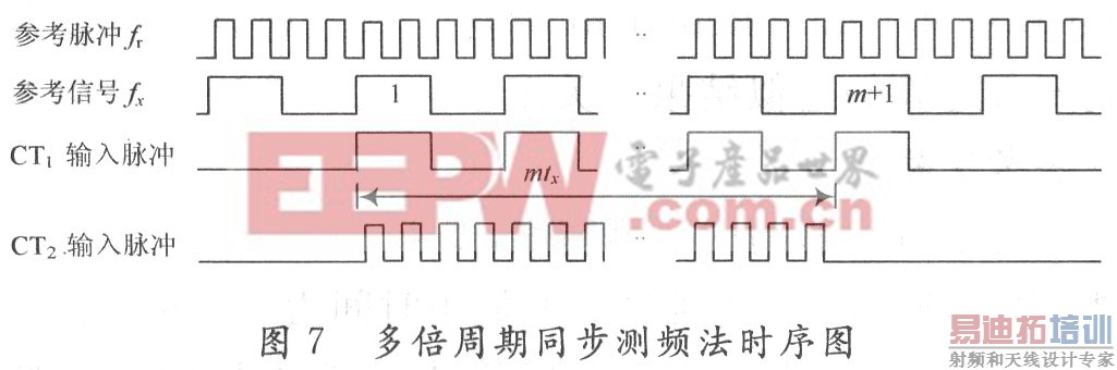 CT1的闸门开放时间完全与fx的m个周期同步。闸门开放时间T1=mtx。在fx的第一个上升沿和第m+1个上升沿之间的mtx时间间隔内,允许CT2对fr计数,计数值记为N。上述测频的时序图如图7所示。