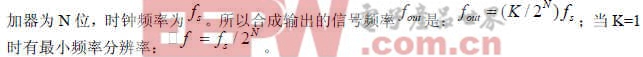 波形信号。在整个过程中相位累加器进行的是线性累加,当累加满时便产生溢出,一个周期完成。相位累加器这个产生溢出的频率就是 DDS的输出频率。设频率控制字为 K,相位累