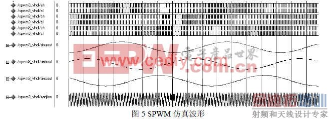本系统选用的是 ALTERA公司的 Cyclone系列的 EP1C3T144C8芯片,操作系统为 Quartus II 6.0。但由于 Quartus II软件自带的波形仿真系统无法观察内部信号波形以及正弦波和三角波的模拟显示,所以采用第三方仿真软件 ModelSim进行波形仿真,它可以直观地看到各个内部节点处的波形,并且可以实现模拟信号输出。完整的 SPWM仿真波形如图 5所示。此仿真图是在载波频率为 5KHz情况下的采样结果。将六路 SPWM波分别加至三相 IGBT逆变器上,经电感滤波后即可产生大功率的纯正弦波来驱动路灯系统。