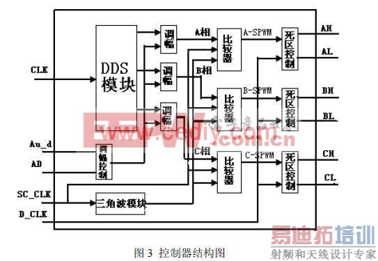 3 控制器的组成结构图 3所示的是 SPWM控制系统的结构图。它主要由 DDS模块、三角波产生模块,幅度调节模块、比较器、死区控制模块等组成。