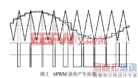 SPWM调制的基本思想是使输出的脉冲宽度按正弦规律变化,可以有效地抑制输出电压中的低次谐波分量,使输出波形为含有高频调制信号的近似正弦的交变电压。实现 SPWM调制的方法很多,采样型 SPWM法是其中一种较常用的方法,它分自然采样法、规则采样法,而规则采样法中又有对称规则采样法与不对称规则采样法。本系统中 ,实际的参考正弦信号是由 DDS产生的数字式正弦信号,因此,在 SPWM产生电路中,实际用作参考信号的是有台阶的正弦信号,如图 2所示。数字正弦波信号的频率和幅度分辨率精确可调,数字三角波信号发生器产生幅值不变的三角波 (称为载波 ) 信号,将它们进行比较,由两者的交点来确定 SPWM波形的高低电平。分析表明,不对称规则采样所形成的阶梯波比对称规则采样时更接近于正弦波,这种方法也更适合于数字方法实现,所以本系统采用的是不对称规则采样的方法。