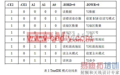 CF卡的访问方式有三种,分别为 I/O模式、 Memory模式和 TrueIDE模式。本系统采用 TrueIDE模式访问 CF卡。需要注意的是当主机电源一直接通时,拔插 CF卡将会使其从原来的 TrueIDE方式重新配置成 Memory方式。所以要让 CF卡一直工作在 TrueIDE模式,需要在电源加电启动时将 OE输人信号接地。此方式也支持 8位存取方式。