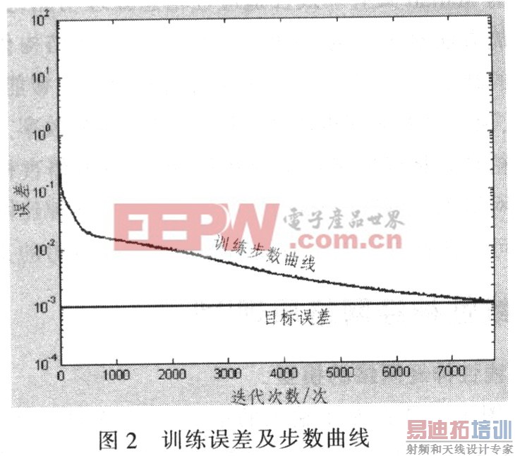 采用其工作原理及Widrow-Hoff规则训练给定系统。训练过程中,当迭代的次数大于10 000或误差小于目标误差时,训练结束。图2为训练后的训练误差及步数曲线,由图2看出,经过7 766步训练后误差达到0.000 999 252小于误差目标e=0.001,训练结束。