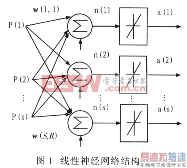 图1是具有R个输入的单层(有S个神经元)线性神经网络结构,其权值矩阵为w,阈值向量为b,这种网络也称为Madaline网络。