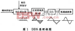 DDS的原理图如图1所示。DDS实现频率合成主要是通过查表的方式进行的。
