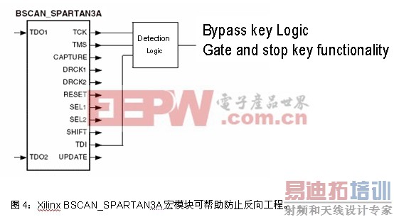 -3A 平台中, 可在设计中使用BSCAN_SPARTAN3A宏模块,其检测逻辑可监控FPGA构造中的JTAG控制信号,如图4所示。如果检测到JTAG控制信号的活动,用户在设计可以立即绕过关键逻辑或关断关键功能,不再执行正确的功能。这样反向工程人员读到的将是不正确的功能模块,在不能完成预期功能的解决方案上浪费时间和资源。