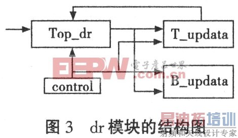 计算的功能,并将计算得到的△r值和前一状态的D(dl,d2,d3)传给T_updata,和B_updata这两个模块;B_updata完成B(x)更新的功能(B(x)一xB(x)或B(x)一△-1nd(x)),将值传给T_updata;T_updata完成T(x)更新的功能(T(x)=d(x)一△rxB(x)),并将计算结果反馈给top_dr,作为当前状态的D(dl,d2,d3);control模块完成控制整个模块的时钟同步。
