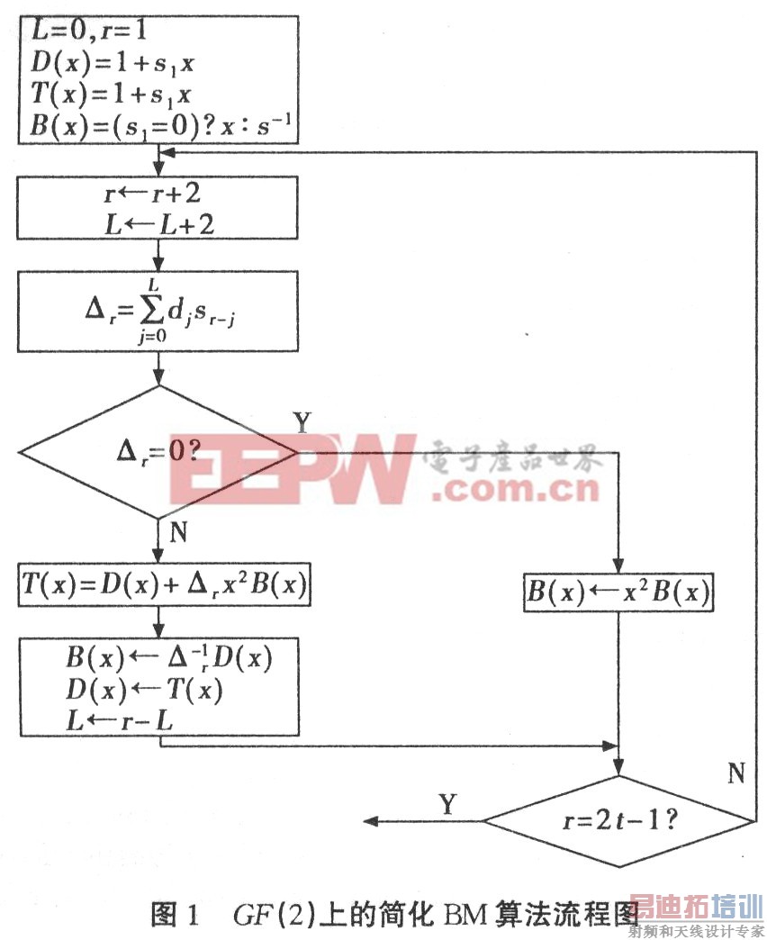 经典的BM算法流程适合任何有限域的BCH码,对于GF(2),我们可以证明当r为偶数时,△r为0[2],此时迭代可以省略。通过对经典BM算法流程图的改进,得到下图l,即GF(2)上的简化BM算法流程图。