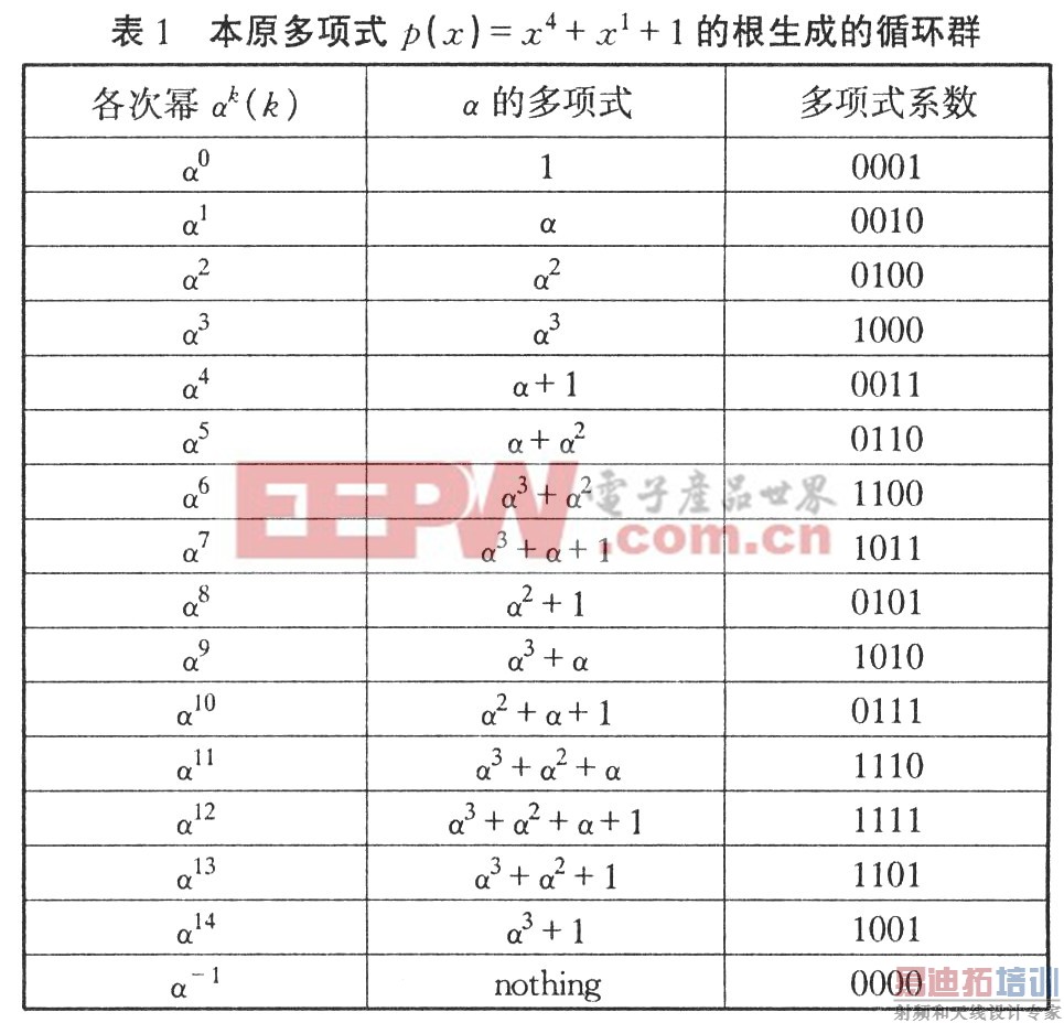 以本文设计的BCH码为例,p(x)=x4+x1+1是GF(2)上的本原多项式。令α为本原多项式的根,m=4,则由{l,α,α2,α3}中元素的线性组合可表示GF(24)上的所有非零元素{α0,α1,α2,…,α14},这些非零元素构成一个循环群如表l所示。最后一行是为了运算的需要,人为加上去的,表示“无”这种状态。