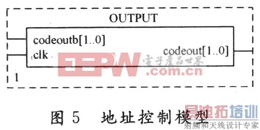 因为经过插“B”模块后,“V”,“B”,“1”已经分别用双相码“11”,“10”,“01”标识,“O”用“00”标识。而在实际应用中,CPLD或FPGA端口输出电压只有正极性电压,在波形仿真中也只有“+1”和“O”,而无法识别“一1”。所以要得到所需要三阶高密度双极性编码的结果,需定义的“00,“01”,“10”来分别表示“0”,“一1”,“+1”。将插“B”模块后输出的“OO”,“01”,“10”,“1l”组合转换为“00”,“01”,“10”组合表示,再通过“00”,“01”,“10”控制四选一数字开关的地址来选择输出通道,就可以实现O,一E,+E。在此本文用CC4052的一组通道作为四选一数字开关,将CPLD或FPGA目标芯片的标识性输出转换成双极性信号,最终实现三阶高密度双极性非归零编码。CC4052接线如图4所示,实现地址控制器的模型如图5所示。