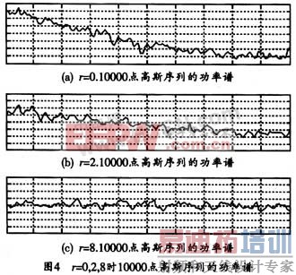 利用 m 序列的周期特性可降低高斯白噪声任意两个不同时刻的采样信号的相关性。在线性反馈移位寄存器中每隔 r 个同步时钟 ( 其中 r=2i , i 为整数 ) 输出一个状态值作为均匀分布的随机数输入可实现均匀分布向高斯分布的转化。为了选择合适的 r 值,图 4 分别给出了 r 为 0 、 2 、 8 时所生成的 10000 点高斯序列的功率谱。由图 4 可见, r=8 时的功率谱基本水平,即系统产生的高斯白噪声任意两个不同时刻的采样信号可看成统计独立的,这与理论上对高斯白噪声的定义相一致。同时也证明了降低相关性模块是可行和有效的。