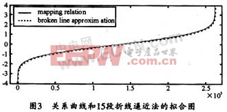 如果直接应用上述映射关系进行均匀分布向高斯分布的转换,则需开辟 (218-1) 个物理空间来建立查找表,这几乎不可能实现。但由图 2 可见,其关系曲线在很大区间上表现出线性关系,所以,可以以斜率不同的直线段分段逼近关系曲线。在一定精度要求下,该方法简单易行,占用硬件资源少,适合在 FPGA 中实现,从而实现由服从均匀分布向服从高斯分布的快速转换。图 3 是关系曲线 ( 实线 ) 和 15 段折线逼近法 ( 虚线 ) 的拟合图,由图可见,其实线和虚线拟合得很好,从而证明了折线逼近法能较好的反映映射关系。