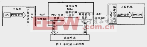 在串行的PWM信号送到IGBT的栅控端之前,还需将该信号转化为并行形式。尽管采用普通的串/并转换芯片可以实现上述功能,但这些芯片的最高工作频率有限,如74166的最高工作频率为35MHz,对于目前广泛采用多重化和多电平技术的变频装置来讲,这种工作频率显然有着较大的局限性。尤其是在实时性、快速性要求甚高的电机控制领域,不可能采用应答方式完成信号的传输,因此接收端需要有较强的纠错和容错能力。若采用普通的芯片,难以只用一两片芯片完成上述功能。但CPLD具有极强的灵活性,内含128个宏单元,最高工作频率可达167MHz(以Cypress CY37128为例),可以只用一两片芯片就能完成较复杂的逻辑功能,因此CPLD与光纤的结合是解决大功率变频器中信号传输的最好选择。系统信号流程图如图1所示。