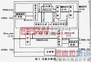 通过前面对数据流和通讯方案的分析,按照自顶向下的原则,我们对信号处理单元进行功能分解,将其分解到下面的各个单元中,见图2。通过功能分解,我们可以看到,单元内部构造可以分为三个部分:一部分对栅控信号进行处理;另一部分对故障信号进行处理;最后一部分用于产生控制故障信号发送的时钟。