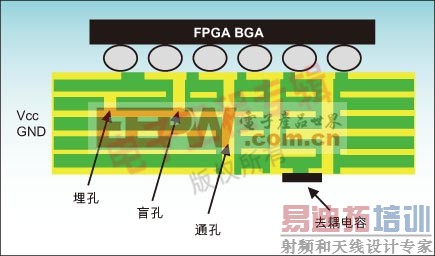 图3-典型的PCB叠层和设计要素(注意BGA焊盘要偏离于过孔)。