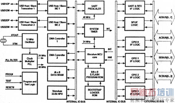 Vinculum的VNCIL控制器是基于定制处理器芯核,它有双直接存储器存取(DMA)引擎来加速数据传输以及使文件系统计算最佳化的32位协处理器。在单芯片上带有64Kbytes嵌入式闪存程序存储器和4Kbytes内部数据SRAM。此芯片的目标是嵌入式USB控制器市场和需要最少外部支持元件的用户。
