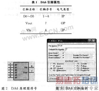 在Proteus ISIS中选择2D工具绘制DA6的原理图符号,如图2所示。并进行引脚编辑,引脚属性设置,如表1所示。图3表示了编辑引脚对话框。