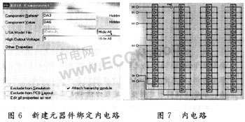 经以上步骤创建的模型只是个模型外壳,还没有仿真功能。其仿真功能主要由内电路完成。将新建的模型DA6放入ISIS编辑区,打开其属性编辑框,选中“Attachhierarchy model”,如图6所示。按OK键后再按键盘Pgdn键,则自动创建并进入内电路设计页。接着在内电路页设计内电路。从Proteus库中选取,他是Analogue Primitive,设计好如图7所示的内电路。并设置内电路中所有DAC原型的属性VHI=<VHI>。