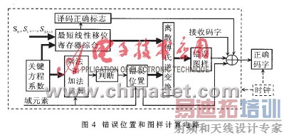 在得到关键方程后,首先应进行错误位置(关键方程的根)的确定,这样可减小电路的规模;利用钱搜索[1](工程上求解σ(x)根的实用方法)的方法可以简捷地确定错误位置。然后,启动最短线性移位寄存器综合和离散傅氏逆变换,经过N次(运算所在域的长度)迭代,即可求得对应各个错误位置的错误图样,如图4所示。用错误图样对接收码字进行纠错,就可得到正确的信息序列。