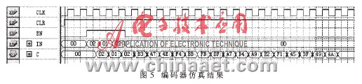 仿真的时钟频率为50MHz,在EN为高电平时输入信息有效。为简单起见,采用系统码的缩短型,即信息为(00,00,…,00,02,01,02)。编码器的仿真结果如图5所示。其中,IN为输入信息,CLK为系统时钟,C为编码输出(输入和输出均为16进制)。