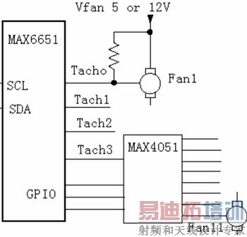 利用MAX6651可以直接监控4个风扇,配合多路模拟开关后,还可以监控更多的风扇,如图1所示。MAX6651的GPIO#2、#3和#4配置为输出,用于控制MAX4051的地址输入,从而由MAX6651的Tach3控制多路复用器选通的风扇。图中所有风扇是并联使用,不能独立控制每个风扇的速度。MAX6651对连接到Tach0的1#风扇进行闭环控制,其它风扇的速度如同1#风扇。