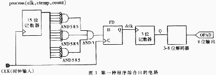 另一主要引起电路复杂化的原因是对设计规划的不合理。虽然VHDL语言能从行为描述生成电路,但一个完整的设计一般来说都不可能由直接描述设计的目标功能来实现的。总要把设计分成若干部分,每一部分再分别描述其行为。这就涉及到如何划分功能模块的问题,要求对设计了解的较深入,才能使划分更有效,才能降低电路的复杂程度。例如我们设计一个时钟源为1kHz,每32秒发出一组信号(共八组)的简单的控制器来说。下面有两种实现方法: