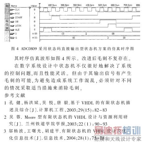 (3)直接把状态机的状态码作为输出信号,即采用状态码直接输出型状态机,使状态和输出信号一致,使得输出译码电路被优化掉了,因此不会出现竞争冒险。这种方案,占用芯片资源少,信号与状态变化同步,因此速度快,是一种较优方案。但在设计过程中对状态编码时可能增加状态向量,出现多余状态。虽然可用CASE语句中WHENOTHERS来安排多余状态,但有时难以有效控制多余状态,运行时可能会出现难以预料的情况。因此它适用于状态机输出信号较少的场合。