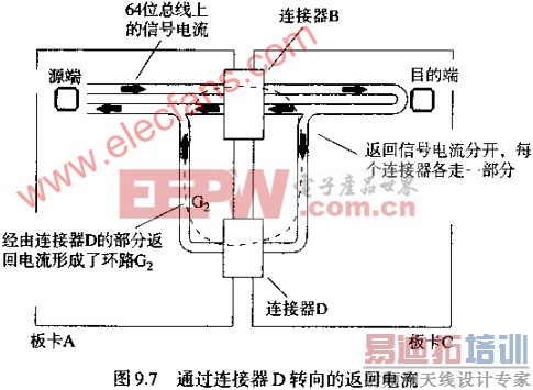 例如,在图9.7中,假设板卡A和C共用两个连接器,另外增加的连接器记为D,将其安排在与连接器B相隔一段距离的地方。现在有一部分信号的返回电流可以由连接器D上的地线流加A,如图9.7中的环路G2所示。