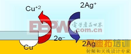 这种形态的油墨结构就提供了化银所谓的“贾凡尼效应”发生的良好环境。这种油墨的undercut 通常会形成狭小的裂缝,而裂缝中溶液无法交换,无法提供足够的Ag 离子。但是在电解质溶液中Cu 不断的失去电子变成Cu 离子,而与此同时溶液中的Ag 离子又不断的得到电子,沉积在裸露的铜面。直至溶液中Ag 离子得到电子与Cu 失去电子水平达到平衡,反应才会终止。因此“贾凡尼”出现的位置表现为银的厚度比正常位置厚。整个过程可用下图表示: