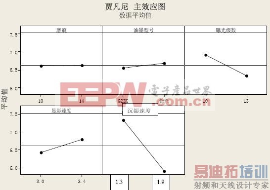 从主效应图中可以看出,在试验的5个因素中,沉银速度是影响贾凡尼效应最大的因素,曝光级数也对贾凡尼效应有较大的影响,显影速度、油墨型号和磨痕对贾凡尼效应没有显著的影响。