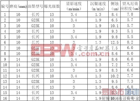 试验主要结合前面分析与实际过程中参数设计了DOE ,选定因子分别为:沉银速度(决定银厚)、阻焊前处理磨痕(决定结合力)、油墨型号、显影速度、曝光级数(三者影响油墨侧蚀)