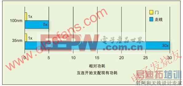 互连正在开始支配开关功耗,就像在前几个工艺节点支配时序一样。右图表明了互连对总动态功耗的相对影响。今天,设计师有能力通过布线优化来减少功耗。