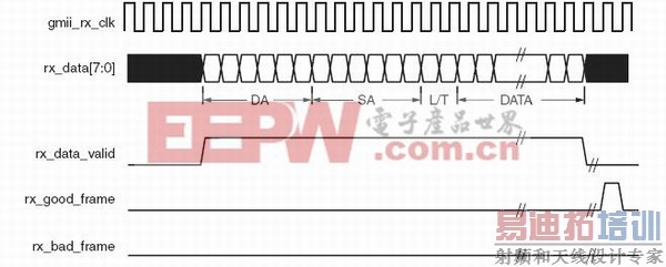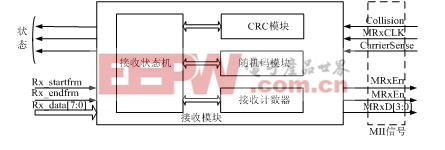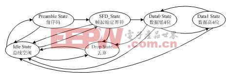 当接收模块检测到数据有效信号之后,,状态机将进入Preamble_State,并开始接收前序码。此后状态机进入SFD_State,接收一个字节的帧起始定界符,之后根据IFGcnt计数器的值进入不同的状态。如果IFGcnt所确定的时间大于96个比特时间,状态机将进入Data0状态以接收字节的低4位,然后是Data1状态,并接收字节的高4位,之后又回到Data0状态。状态机就一直在这两个状态之间循环,直到数据接收完毕(PHY清除MRxDV信号)后进入Idle,以重新等待接收新的数据;如果接收到帧起始定界符时,IFGcnt计数器所确定的时间小于96个比特时间,那么状态机将进入Drop_State状态,并一直维持该状态直到数据有效信号结束(PHY清除MRxDV信号)。之后,状态机再回到Idle等待接收新的数据。如果在接收前序码、帧起始定界符和数据期间,数据有效信号被清除,那么状态机将回到Idle。