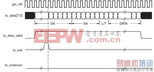 发送引擎的时序如图10-38所示。当客户端有数据发送时,将tx_data_valid拉高,同时将数据的第一个字节置于tx_data端口;当GEMAC将第一字节数据读入后,会将tx_ack信号拉高,用户端逻辑检测到tx_ack为高时,要在下一个时钟上升沿将其余的数据发送到数据端口上,当数据发送完毕后,将x_data_valid拉低。